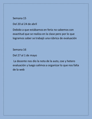 La semana 12 fue Semana Santa. En la semana 13, los estudiantes hicieron un recorrido por su sitio web digital y recibieron instrucciones para completar un trabajo en Word. La docente también enseñó la rúbrica de evaluación para grados 6-8. En la semana 15, debido a que hubo feria escolar, no está claro qué se cubrió en clase pero se trabajó en una rúbrica de evaluación. Finalmente, en la semana 16 la docente entregó las calificaciones de la auto, hetero y coevaluación y los estudiantes organizaron