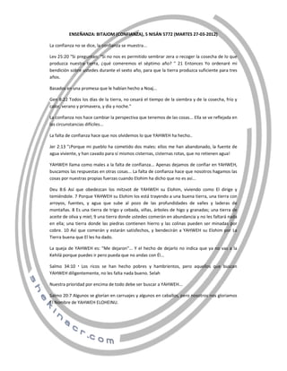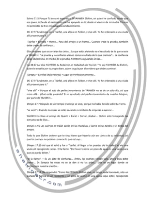 Este documento habla sobre la confianza en Dios. Explica que la confianza se demuestra a través de las acciones y no solo con palabras. Relata historias bíblicas como cuando Dios prometió bendecir la cosecha del sexto año para alimentar al pueblo durante tres años. También habla sobre cómo la falta de confianza lleva a buscar soluciones por fuera de Dios. Finalmente, analiza la historia de Elías y la viuda de Sarepta, donde Elías confió en que Dios proveería para ellos a trav