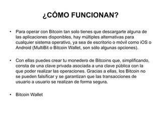 Bitcoin es una moneda virtual e intangible que puede usarse como medio de pago al igual que el dinero físico. Los usuarios pueden comprar, vender y transferir bitcoins utilizando aplicaciones en sus dispositivos electrónicos, las cuales crean una clave privada y pública para realizar transacciones de forma segura entre usuarios. Existen varias formas de adquirir bitcoins como comprarlos en mercados virtuales, intercambiarlos por bienes y servicios, o minarlos resolviendo problemas matemáticos complejos.