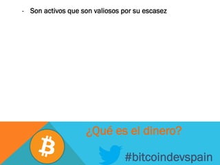 El documento describe brevemente la historia del dinero, desde el uso del oro como primera moneda hasta la creación del dinero fiduciario y el dinero FIAT. Explica qué es el Bitcoin, cómo funcionan las direcciones Bitcoin, las transacciones y la blockchain. También cubre temas como la minería, los mensajes en la blockchain y otros principios básicos.