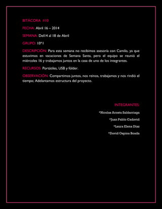 La bitácora #10 describe la semana del 14 al 18 de abril para el Grupo 10*1. Durante esta semana no recibieron asesoría debido a las vacaciones de Semana Santa, pero el miércoles 16 el equipo se reunió en la casa de uno de los integrantes para trabajar juntos en el proyecto utilizando portátiles, USB y un fólder, donde compartieron, se reunieron y adelantaron la estructura del proyecto.