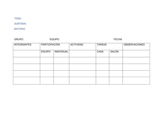 Este documento es una plantilla para registrar la participación de los integrantes de un equipo o grupo en diferentes actividades y tareas, tanto en el salón de clase como en casa. La plantilla incluye espacios para anotar el tema, subtema y materia de estudio, así como los nombres de los integrantes del equipo y detalles sobre su participación y responsabilidades individuales y como equipo.