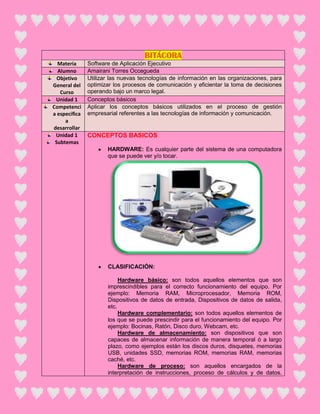 El documento presenta información sobre conceptos básicos de hardware, software, sistemas de información, redes e Internet. Define cada tema y ofrece ejemplos de clasificaciones comunes. También describe brevemente la historia de Internet y algunas aplicaciones comunes como la videoconferencia y el control remoto de equipos.