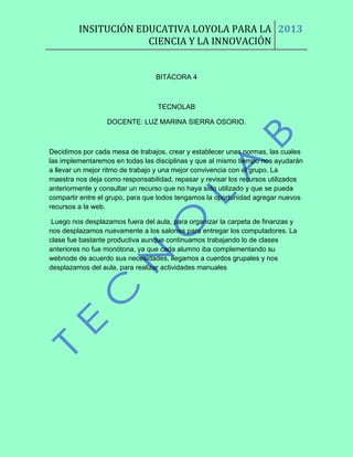 El documento describe las actividades de una clase en el laboratorio de tecnología (Tecnolab) en la Institución Educativa Loyola para la Ciencia y la Innovación en 2013. Los estudiantes establecieron normas de trabajo por mesa y se les asignó la tarea de revisar y compartir recursos existentes y nuevos para agregar a su sitio web. Organizaron su carpeta de finanzas y devolvieron los computadores antes de realizar otras actividades fuera del aula.