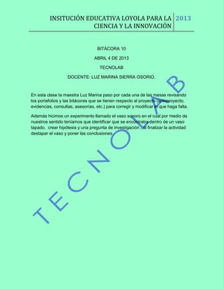La maestra Luz Marina revisó los portafolios y bitácoras de cada grupo sobre su proyecto para corregirlos y modificarlos. Los estudiantes realizaron un experimento llamado el vaso sonoro donde tenían que identificar un objeto dentro de un vaso tapado mediante sus sentidos, crear hipótesis y una pregunta de investigación, y luego destapar el vaso y sacar conclusiones.