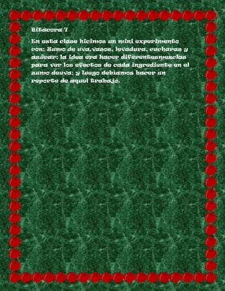 Realizaron un experimento con zumo de uva, vasos, levadura, cucharas y azúcar para mezclarlos de diferentes maneras y observar el efecto de cada ingrediente en el zumo. Luego debían escribir un informe sobre los resultados del trabajo.