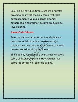 Las bitácoras describen las actividades semanales de un grupo en clases de tecnología. En las primeras semanas, el grupo trabajó en equipos para crear carteles y discutir sus proyectos de investigación, incluyendo la selección de temas y el desarrollo de preguntas de investigación. Más adelante, la profesora les asignó una tarea sobre el trabajo colaborativo y revisaron el diseño y formato de páginas en Word.