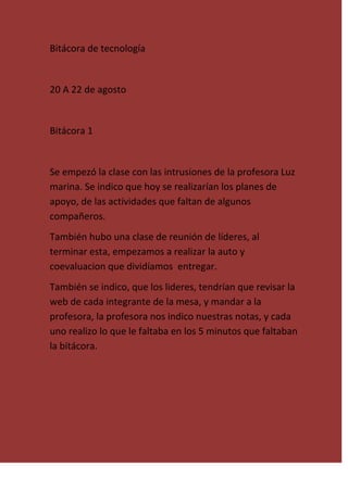 La bitácora describe las actividades de una clase de tecnología los días 20 al 22 de agosto. La profesora Luz Marina indicó que se realizarían planes de apoyo para algunos compañeros y que los líderes revisarían las páginas web de cada integrante de la mesa para enviar a la profesora. Los estudiantes también completaron una autoevaluación y coevaluación y la profesora les informó sus notas.