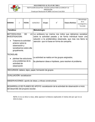El documento presenta el seguimiento al plan de área de la Institución Educativa Colegio Loyola para la Ciencia y la Innovación para la semana del 13 de marzo de 2012. Se describen las temáticas abordadas sobre metodología de investigación y el Tecnolab, los recursos y métodos utilizados, y la evaluación y observaciones de las actividades realizadas por los estudiantes en grupos.