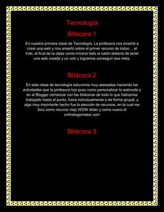 Las bitácoras resumen 5 clases de tecnología en las que los estudiantes aprendieron sobre la creación de páginas web y blogs, agregaron recursos como Voki y WOW slider a sus sitios, investigaron sobre el cambio climático en equipo, y la maestra explicó Google Docs y revisó su progreso.