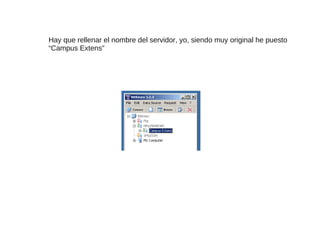 Este documento proporciona instrucciones para configurar una conexión WebDAV entre un servidor y una computadora local. Primero, elimina cualquier entrada existente y crea una nueva conexión WebDAV. Luego, completa los detalles del servidor como el nombre, usuario y contraseña, asegurándose de seleccionar la opción correcta de seguridad SSL. Finalmente, especifica los directorios compartidos y podrá acceder y transferir archivos entre el servidor y su computadora.