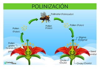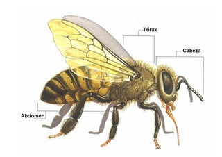 El documento describe las partes del cuerpo de las abejas, incluyendo ojos, antenas, aguijón y trompa. Explica que las abejas polinizan las flores al libar néctar y transportar polen en su cuerpo y patas. También describe las colmenas naturales y artificiales, los panales de cera con celdillas hexagonales, y los habitantes de la colmena como la reina, obreras y zánganos. Detalla las funciones de las obreras como recolectoras, constructoras y nodrizas, así como los al
