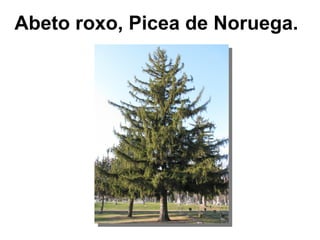 El documento menciona diversas especies de árboles en el colegio, incluyendo abeto roxo, picea de noruega, y cedro do líbano, entre otros. También se presenta el proyecto 'Os nosos bosques' correspondiente al curso 2011/2012 en la localidad de Ferrol. El énfasis está en la diversidad arbórea del entorno educativo.
