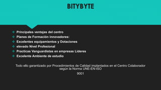 Este documento presenta la Academia de Informática Bitybyte ubicada en Palma de Mallorca. Ofrece una variedad de cursos de informática gratuitos para desempleados y cursos de pago para formación laboral y profesional. Los cursos se imparten en dos aulas equipadas con ordenadores de última generación. La academia ofrece cursos innovadores con un enfoque práctico y nivel profesional alto.