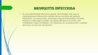 La bronquitis infecciosa aviar es una enfermedad viral aguda que causa inflamación de las vías respiratorias superiores en aves, lo que resulta en tos, estornudos y descargas nasales. La enfermedad se transmite fácilmente entre aves y causa pérdidas económicas a la industria avícola debido a reducciones en el peso y la producción de huevos. El virus de la bronquitis infecciosa es frágil y se inactiva a temperaturas superiores a 45°C.