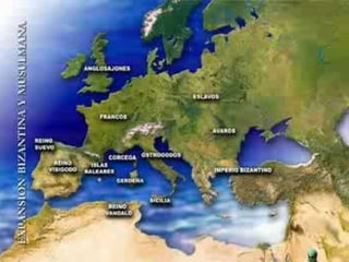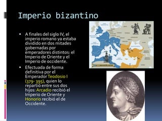 El Imperio Romano se dividió en dos mitades en el siglo IV d.C., dando lugar al Imperio de Occidente y al Imperio de Oriente. Este último pasó a conocerse como Imperio Bizantino tras la caída de Roma en el siglo V d.C. y duró hasta 1453 d.C., cuando los turcos conquistaron Constantinopla. Bizancio desempeñó un papel crucial como transmisor de la cultura clásica a Occidente y como baluarte frente a las invasiones.