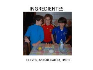 El documento presenta una receta para hacer un bizcocho. Detalla los ingredientes necesarios como huevos, azúcar, harina y cáscara de limón rallada. Explica los pasos del proceso de elaboración, que incluyen batir los huevos, mezclarlos con los demás ingredientes y verter la mezcla en un molde engrasado para hornearlo a 220°C hasta que una aguja salga limpia al pincharlo. El bizcocho está listo para servirse.