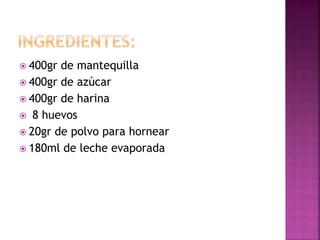 La receta del maestro incluye ingredientes como mantequilla, azúcar, harina, huevos, polvo para hornear y leche evaporada. Se bate las claras a punto de turrón y se le agrega la mantequilla con el azúcar previamente cremada. Luego se agregan las yemas una por una e integrar los polvos cernidos y la leche evaporada. Finalmente, se vierte la mezcla en un molde enmantequillado y enharinado y se hornea a 180°C por 40 minutos.