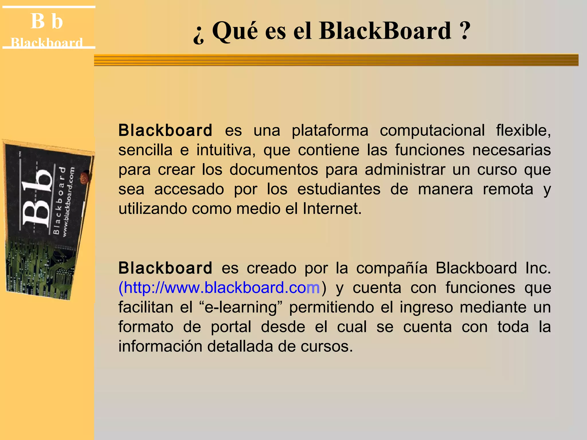 Blackboard es una plataforma educativa en línea que permite a profesores crear y administrar cursos de forma remota para que los estudiantes puedan acceder a ellos. Ofrece funciones como anuncios, materiales de curso, tareas, exámenes y calificaciones. Los estudiantes pueden acceder a sus cursos en Blackboard y participar en discusiones, intercambiar archivos y ver calendarios y tareas asignadas.