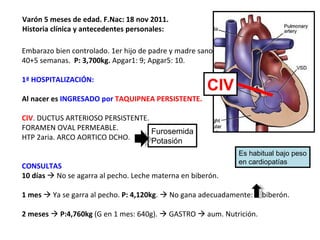 (1) Este caso describe la historia clínica de un niño de 5 meses con anemia y problemas respiratorios. (2) Tras varias hospitalizaciones para tratar la anemia y bronquitis, se diagnosticó anemia de Blackfan-Diamond mediante un estudio de médula ósea. (3) El niño requirió transfusiones de concentrado de hematíes y otros tratamientos para controlar la anemia y problemas respiratorios asociados a su condición.