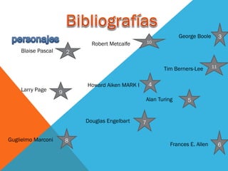Este documento presenta breves biografías de 11 personas importantes en el desarrollo de la computación e Internet. Incluye pioneros como Blaise Pascal, que inventó la primera máquina de calcular mecánica, y Alan Turing, considerado el padre de la ciencia de la computación. También incluye innovadores como Tim Berners-Lee, el creador de la World Wide Web.