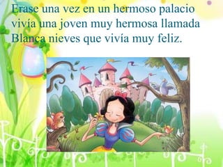 La madrastra de Blanca Nieves, celosa de su belleza, intenta matarla enviando a un sirviente para que le traiga su corazón. El sirviente se compadece y deja ir a Blanca Nieves. Ella encuentra refugio en la cabaña de los 7 enanitos. Más tarde, la madrastra engaña a Blanca Nieves para que coma una manzana envenenada haciéndose pasar por una anciana. Blanca Nieves muere pero es revivida por el beso de un príncipe.