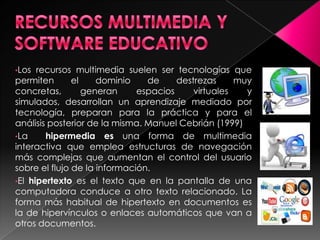 Este documento describe los recursos multimedia y software educativo, sus características y clasificaciones. Explica que los recursos multimedia permiten el desarrollo de destrezas específicas a través de entornos virtuales y simulaciones. También cubre las ventajas y desventajas del uso de recursos multimedia e Internet en educación, como el acceso a información actualizada pero también los riesgos de distracción y dependencia.