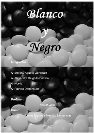 Este documento presenta los resultados del proyecto "Blanco y Negro", una webserie creada por estudiantes de la UPC para el curso de Nuevos Medios. La webserie constó de 3 episodios publicados en YouTube con el objetivo de contar la historia de Rodrigo y su lado oscuro. Se utilizaron Facebook, Twitter y hashtags para promoverla. Los videos tuvieron en total 738 vistas de diferentes países. El proyecto cumplió con viralizar la serie más allá de sus conocidos con bajo presupuesto.