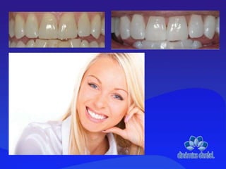 El documento habla sobre el blanqueamiento dental, un tratamiento seguro y efectivo para aclarar los dientes. Explica que involucra la aplicación de peróxido de carbamida u otros agentes blanqueadores a los dientes para desaturar su color de forma no invasiva. Señala que es un procedimiento muy popular que puede realizarse en el consultorio dental o de forma ambulatoria y tiene buenos resultados con alta satisfacción de los pacientes.
