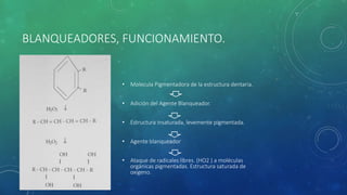 El documento compara las técnicas de blanqueamiento dental vital con y sin activación con luz. Resume que la aplicación de luz no aumenta la eficacia del blanqueamiento con peróxidos de alta concentración, pero sí acelera el blanqueamiento con peróxidos de baja concentración. Sin embargo, la luz incrementa la sensibilidad dental debido al calor generado, el cual provoca una respuesta inflamatoria a través de la liberación de sustancia P.