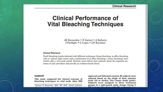 Este documento resume diferentes técnicas y productos para blanqueamiento dental vital, así como sus efectividades traducidas en el tiempo que dura el blanqueamiento. Revisa meta-análisis, ensayos clínicos controlados y ensayos clínicos de PubMed sobre blanqueamiento dental vital en pacientes con manchas extrínsecas. Concluye que se debe ser meticuloso en la búsqueda y ajustarse al protocolo PICOT, y evaluar el método, análisis estático y resultados de la investigación obtenida. También discute