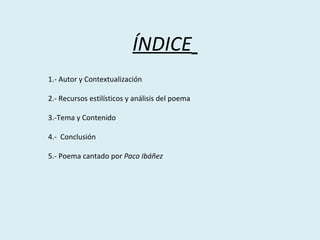 El documento analiza el poema "En el principio" del poeta español Blas de Otero. Explica el contexto y la vida de Otero, marcada por la época franquista. Luego, analiza los recursos literarios y el tema del poema, en el que Otero expresa su insatisfacción con España a pesar de haber perdido mucho luchando por sus ideales, pero mantiene la esperanza en "la palabra".