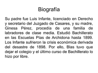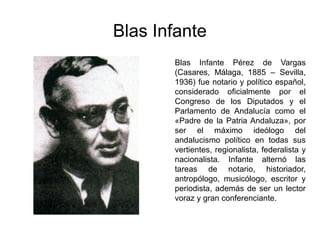 Blas Infante fue un político y notario español considerado el padre de la patria andaluza. Nació en 1885 en Casares, Málaga. Trabajó promoviendo el andalucismo político y defendiendo la identidad andaluza. Estudió bachillerato en Archidona y derecho en la Universidad de Granada, donde se graduó en 1906. Fue un intelectual que se dedicó a la historia, antropología y periodismo, además de su trabajo como notario. Murió asesinado en Sevilla en 1936.