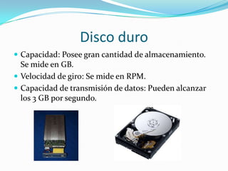 Este documento describe y compara diferentes dispositivos de almacenamiento, incluyendo discos duros, disquetes, unidades de CD, DVD, tarjetas de memoria y almacenamiento en línea. Explica las capacidades de almacenamiento, velocidades y otras características clave de cada dispositivo.