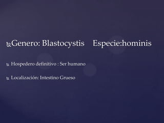 Este documento describe Blastocystis hominis, un parásito unicelular que infecta el intestino grueso de los seres humanos. Se clasifica taxonómicamente y se describen sus características morfológicas y su ciclo de vida. También se explica su diagnóstico, epidemiología, prevención y control e importancia como parásito común en países en desarrollo.