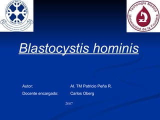 Blastocystis hominis es un protozoario patógeno que habita en el intestino grueso de humanos y algunos primates, con formas morfológicas diversas. La transmisión ocurre por vía oral-fecal, y se asocia con síntomas como diarrea y otras manifestaciones clínicas. Es especialmente prevalente en países en desarrollo y se recomienda un diagnóstico a través de análisis fecales y tratamiento con metronidazol, entre otros.