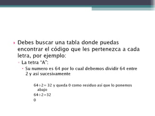 El documento explica cómo convertir un número decimal a binario mediante la división sucesiva por 2 y anotando los residuos de cada división de derecha a izquierda. Luego se suman los residuos ponderados por su posición binaria para obtener el número equivalente en binario.