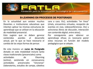 Este documento describe los componentes clave de un programa de posgrado que utiliza el modelo de aprendizaje híbrido o blended learning (B-learning). Explica que el B-learning combina actividades presenciales y en línea para proporcionar flexibilidad a los estudiantes. También destaca la importancia de la planificación, la infraestructura, la capacitación docente y el uso de una metodología como PACIE para lograr un aprendizaje efectivo a través de este modelo.