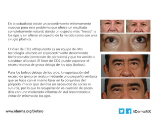 Este documento describe un procedimiento láser mínimamente invasivo llamado blefaroplastía para corregir bolsas y ojeras en los ojos de forma natural. El láser de CO2 puede vaporizar el exceso de grasa debajo de los ojos sin necesidad de cortes ni suturas, proporcionando una recuperación rápida. Cuando existe un hundimiento de ojeras, la grasa extraída de las bolsas puede inyectarse para levantar esta área de forma natural. Este procedimiento ambulatorio dura menos de 30 minutos y requiere una recuperación