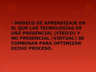 El documento describe el aprendizaje semipresencial o blended learning, un modelo educativo que combina actividades presenciales y virtuales. El blended learning implica entre un 25-75% de actividades en cada modalidad. Tiene ventajas como la relación costo-efectividad y flexibilidad, aunque también desventajas como requerir acceso a tecnología. Plataformas como Moodle son útiles para crear cursos blended learning.