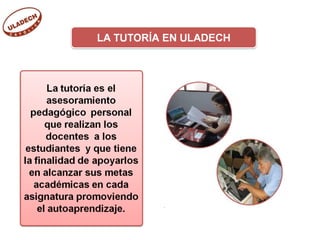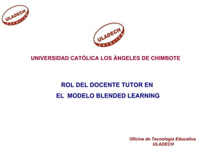 El documento describe el rol del docente tutor en el modelo blended learning en la Universidad Católica Los Ángeles de Chimbote, destacando la importancia de la formación y capacitación de los docentes para realizar funciones tutoriales efectivas. Se enfatiza que la labor tutorial combina sesiones presenciales y virtuales, utilizando la plataforma Moodle para facilitar la comunicación y el aprendizaje. Además, se subraya que los docentes deben conocer los intereses y habilidades de los estudiantes, y estar preparados para adaptar sus estrategias educativas en diversos escenarios de enseñanza.