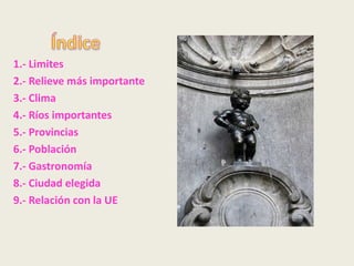 Bélgica es un país triangular de 30,528 km2 ubicado en el noroeste de Europa, limitando con el Mar del Norte, Países Bajos, Alemania y Luxemburgo. Se divide en tres regiones: la planicie costera, la meseta central y las Ardenas. Su capital y ciudad más grande es Bruselas, sede de la Unión Europea.