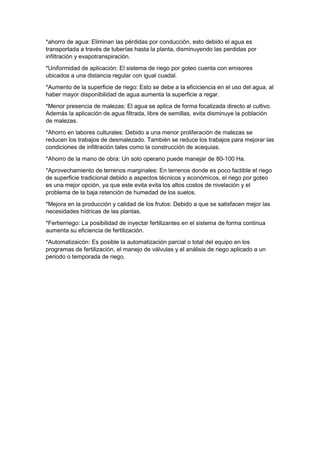 Este documento describe el sistema de riego por goteo como una forma más eficiente de regadío que ayuda a enfrentar la crisis mundial del agua. Explica que el riego por goteo distribuye el agua directamente a las raíces de las plantas a través de una red de tuberías y emisores, lo que permite ahorrar agua, fertilizantes y mano de obra en comparación con otros métodos de riego. También señala algunas ventajas clave como la uniformidad de la aplicación del agua, el aumento de la super