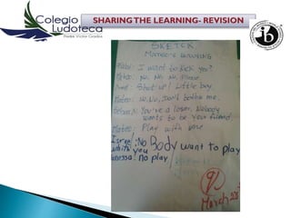 El documento presenta información sobre un grupo de maestros que enseñan inglés y español a estudiantes de los grados 4 a 6 en una escuela primaria y secundaria en Quito, Ecuador en 2014. El documento también discute los derechos y deberes de los ciudadanos, el acoso escolar, y la participación ciudadana para lograr cambios positivos. Los estudiantes exploran estos temas a través de videos, dibujos, y conferencias sobre los derechos humanos.