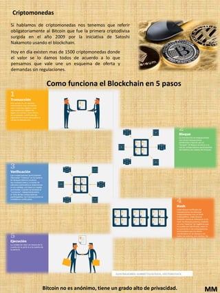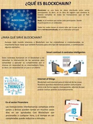 Blockchain es una base de datos distribuida entre varios participantes (nodos) que contiene la historia completa de todas las transacciones realizadas. Funciona como una red descentralizada sin un ordenador principal. Blockchain puede usarse para smart contracts, el Internet de las cosas, transacciones financieras interbancarias y criptomonedas como Bitcoin.