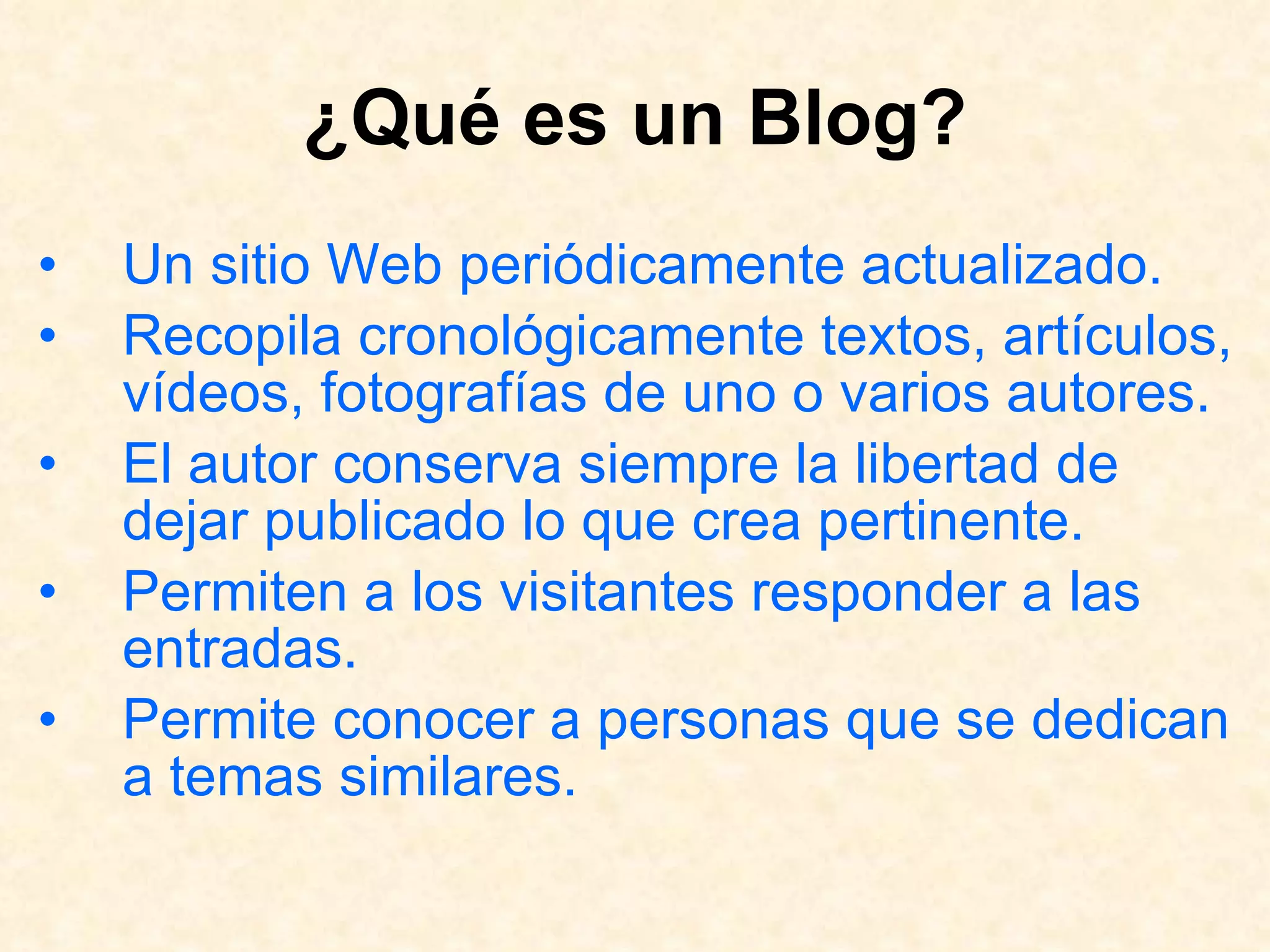 Un blog es un sitio web periódicamente actualizado que recopila cronológicamente textos, artículos, videos y fotos de uno o varios autores. Los docentes pueden usar blogs como un medio para comunicarse con los padres y la institución educativa, así como mostrar las actividades de los alumnos y usarlo como una herramienta para que los alumnos adquieran conocimientos y habilidades. Los blogs se pueden crear fácilmente en plataformas como Blogger de Google.