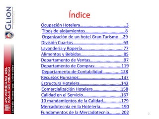 Este documento describe varios tipos de alojamientos turísticos, incluyendo hoteles, moteles, cabañas, albergues, hostales y más. También explica conceptos como ocupación hotelera y diferentes planes de alojamiento. Finalmente, proporciona ejemplos de cómo calcular la ocupación hotelera y datos estadísticos sobre el crecimiento reciente de la industria hotelera en México.