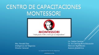 Este documento presenta el Centro de Capacitaciones Montessori, dirigido por Msc. Ronald Díaz e Lic. Yadira Cansino. El centro ofrece capacitaciones y cuenta con una dirección y números de contacto. Adicionalmente, el documento explica los pasos para registrarse y cargar documentos en la plataforma SlideShare, incluyendo la creación de una cuenta vinculada a LinkedIn y la selección y carga de archivos.