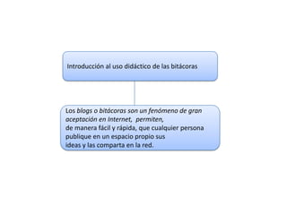 Los blogs permiten publicar ideas de manera fácil y rápida. Pueden usarse como herramientas educativas y comunicativas. Los blogs tienen entradas ordenadas cronológicamente, admiten formatos multimedia, y permiten comentarios e intercambio de ideas entre usuarios. Los blogs también pueden usarse en el aula de diferentes maneras como diarios de clase, proyectos grupales o publicaciones electrónicas.