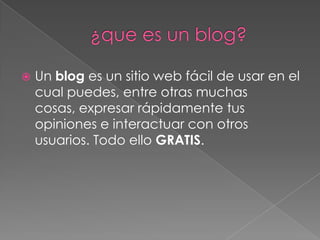 Un blog es un sitio web fácil de usar donde se pueden expresar opiniones e interactuar con otros de forma gratuita. Se pueden crear blogs en páginas como Blogger.com o Wordpress.com dando un correo electrónico, contraseña y nombre de usuario. Estas herramientas ofrecen diferentes niveles de control, desde servicios completos hasta opciones para tener el control total con dominio y hosting propios.